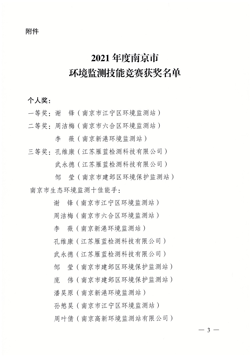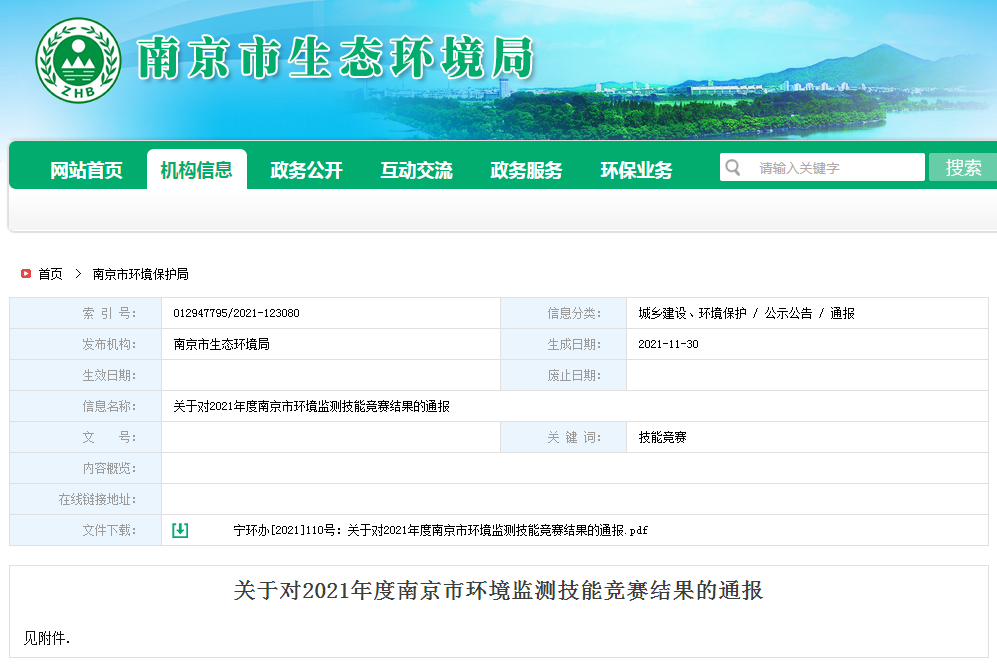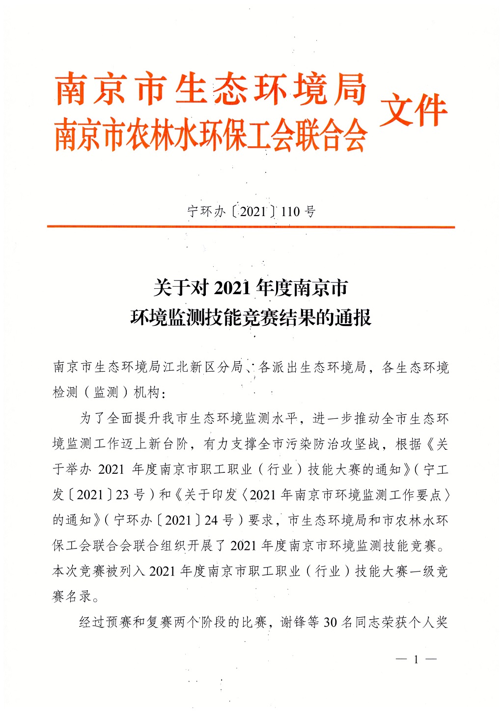 關于對2021年度南京市環境監測技能競賽結果的通報