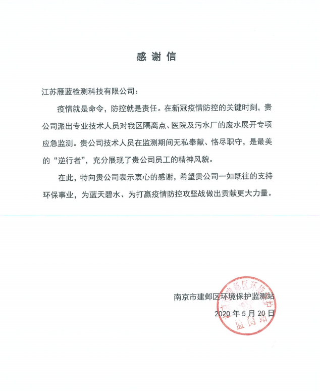 在疫情期間,受建鄴、雨花、江北等環(huán)保部門委托,我公司負責對各區(qū)隔離點、醫(yī)院及污水廠的廢水展開專項應急監(jiān)測。在克服防護物資緊缺、人員調配困難的情況下深入一線保質保量完成檢測工作,為管理部門提供1000余份檢測數(shù)據(jù)。